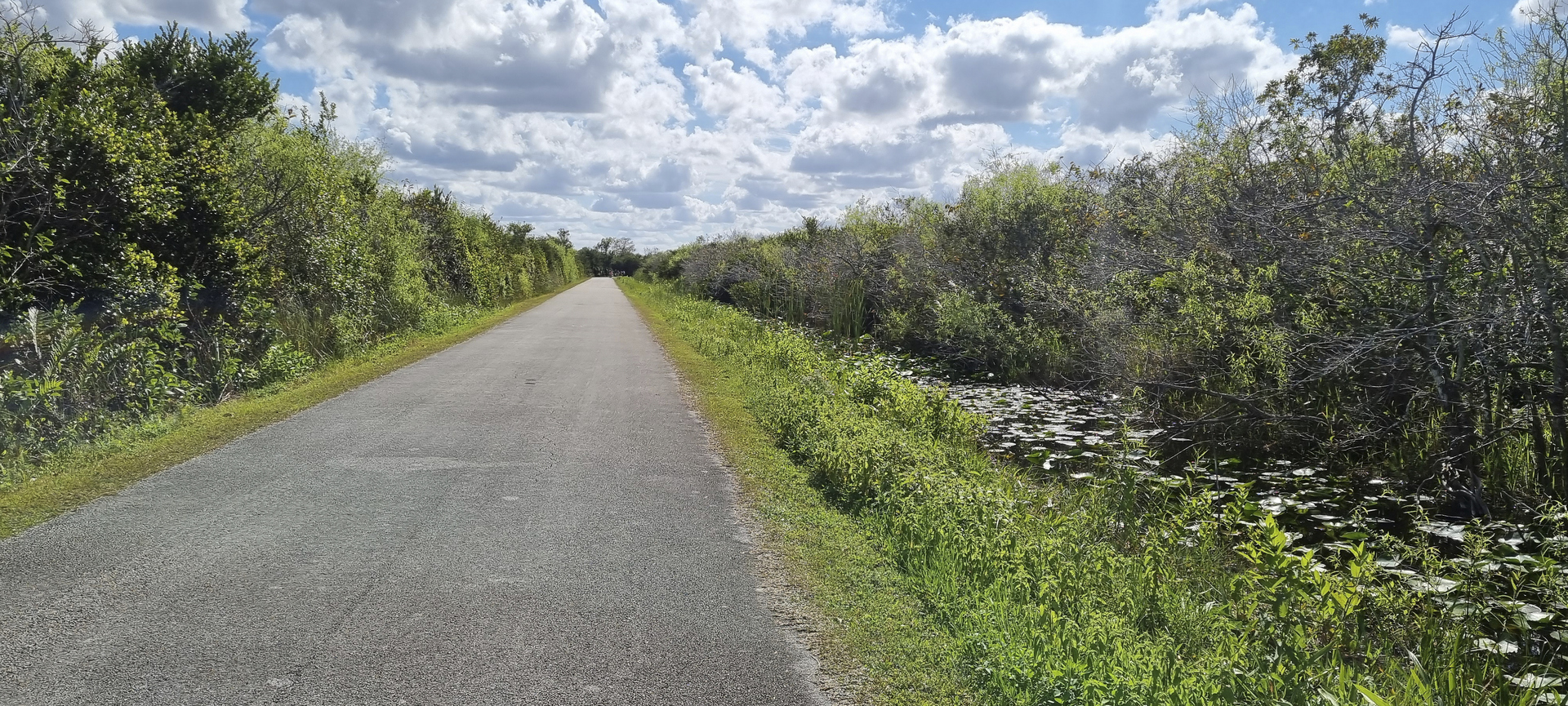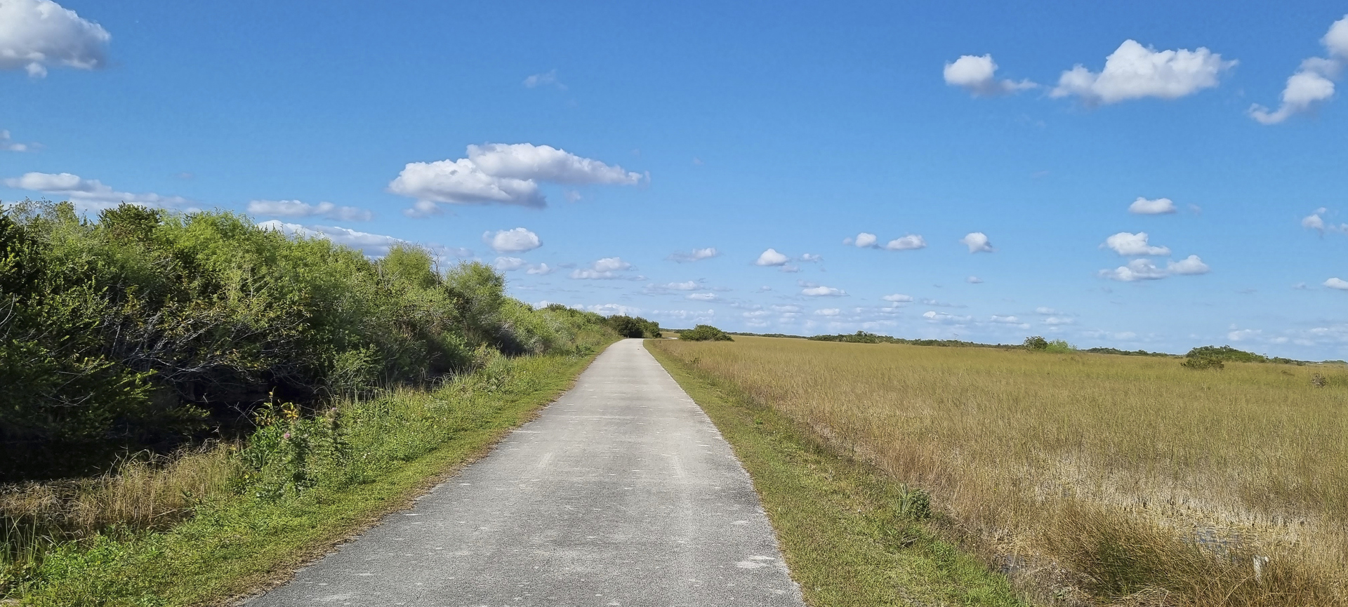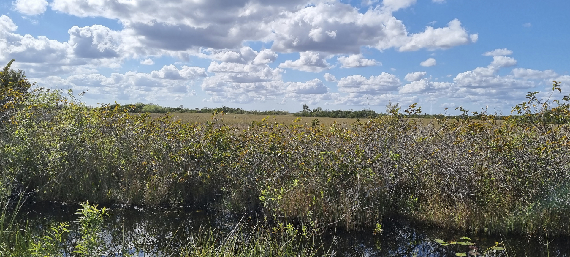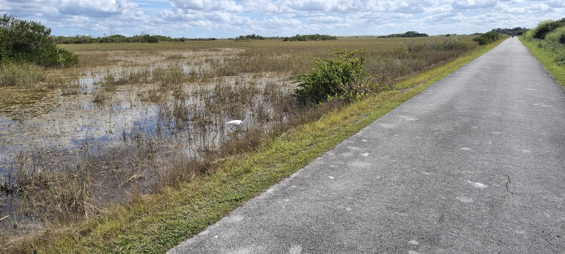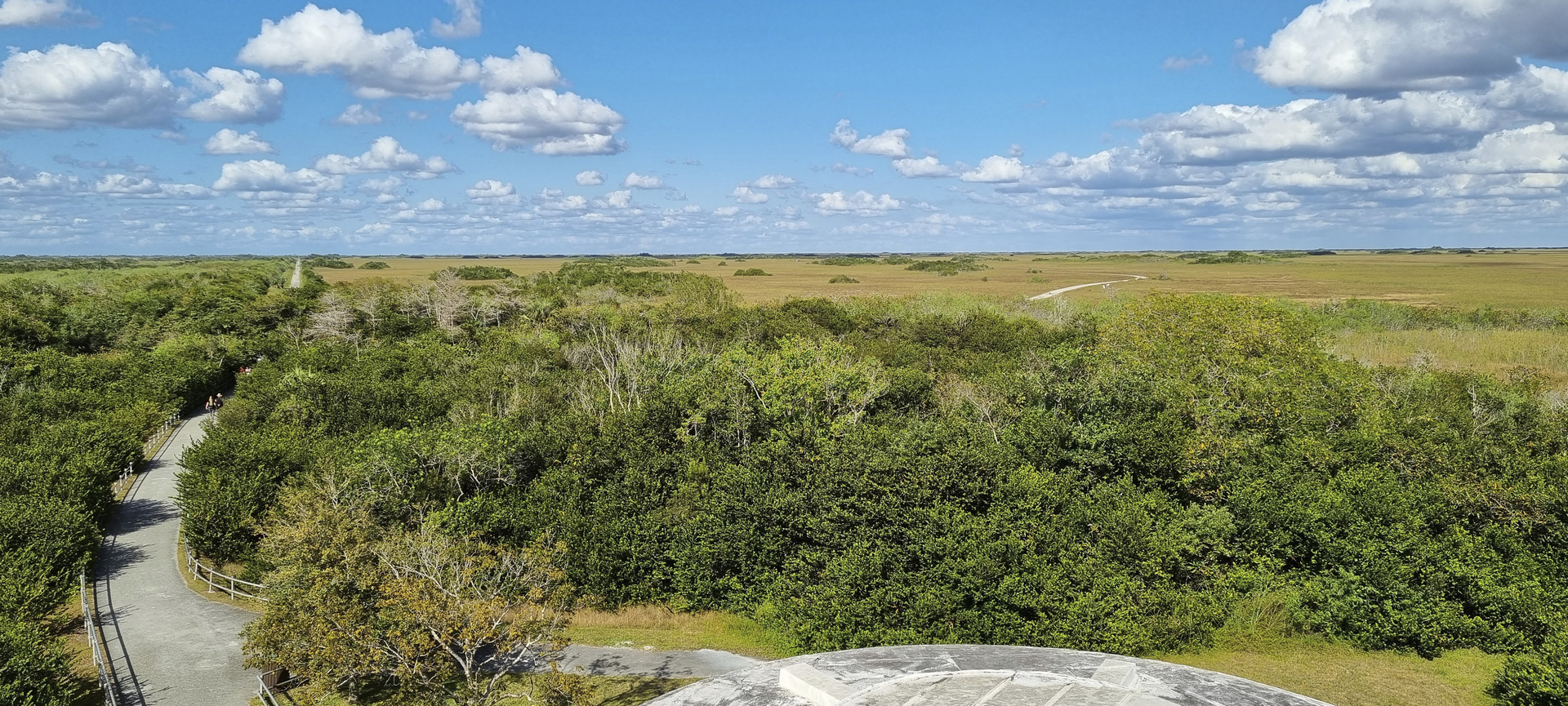 70 kilometrov vzhodno od Zalivske obale najdemo center za obiskovalce Shark Valley, kjer se lahko peš, s kolesom ali pa s turističnim vlakcem podamo enajst kilometrov v notranjost parka po asfaltirani stezi. Ob stezi teče potok, ki je poln aligatorjev, sicer pa nas obdaja prostrana prerija, kjer raste trava rezika (sawgrass), ki je značilna za Everglades. Večino leta je prerija poplavljena, le pozimi se za nekaj mesecev reka umakne toliko, da se vidi do tal. V Evergladesu višinska razlika le kakšnih deset centimetrov močno vpliva na to, katere rastline na določeni lokaciji uspevajo: monotonost prerije razbijejo otoki dreves, ki uspevajo le zato, ker so tla malo višja. Ravno ti otoki so ameriškim staroselcem omogočili preživetje v tako neprijaznem okolju, saj je večina Evergladesa poleti sicer poplavljena. Na teh otokih najdemo drevesa tropskih vrst, kot sta mahagoni in gumbo limbo, pa tudi nam bolj poznane vrste kot na primer hrast in javor.