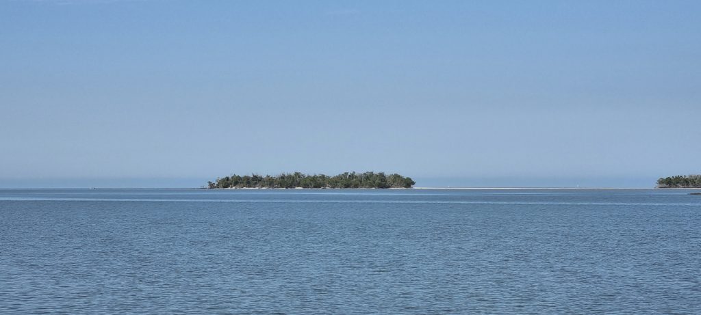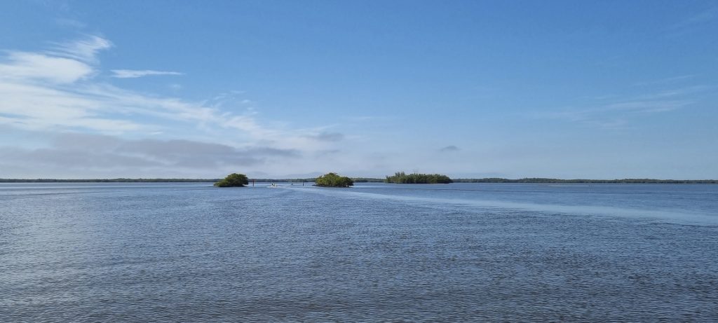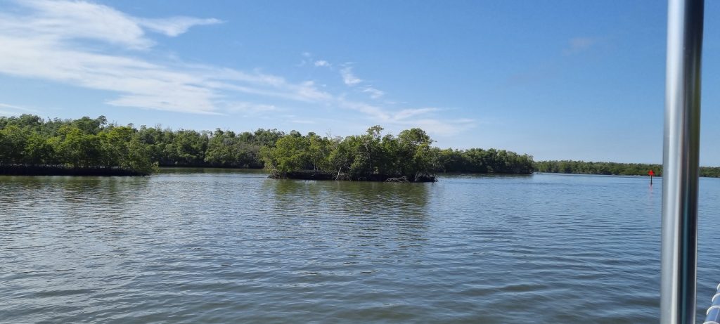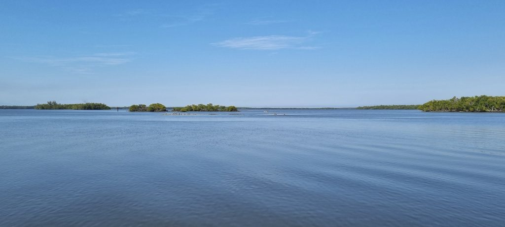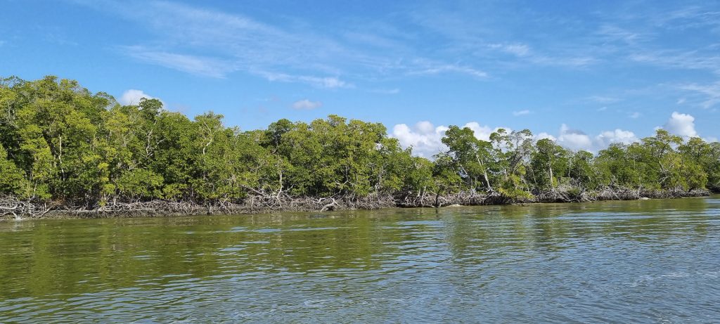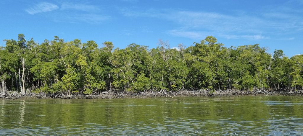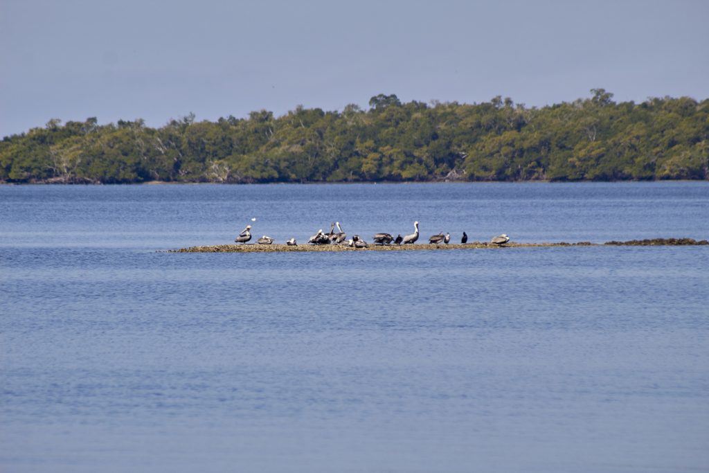 Center za obiskovalce na Zalivski obali se nahaja v mestu Everglades City ob morju, kjer je ogled parka možen le s čolnom. Za obiskovalce je organiziran voden ogled verige otokov, imenovane Ten Thousand Islands (Deset tisoč otokov). Za obalne dele parka so značilne mangrove – drevesa, ki najbolj uspevajo v slankasti vodi, kjer se reka počasi izliva v morje. Mangrove igrajo pomembno vlogo v zaščiti obale, saj jo ščitijo pred poplavami in erozijo. Tu najdemo tudi več vrst čapelj, kormoranov, pelikanov in drugih ptic, ki gnezdijo v drevesih in tudi na prometnih znakih za čolne, ki so postavljeni v morju, kjer pa pogosto lahko opazimo delfine – na vodenem ogledu se jih je našemu čolnu pridružila cela jata.