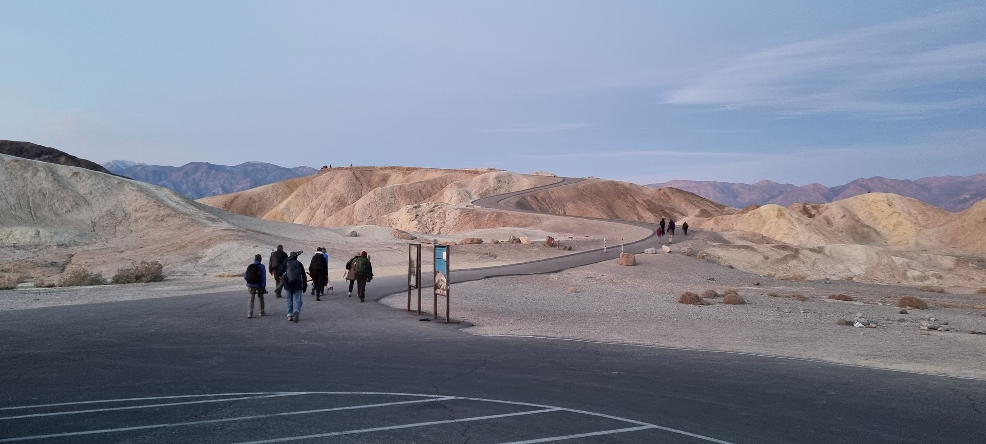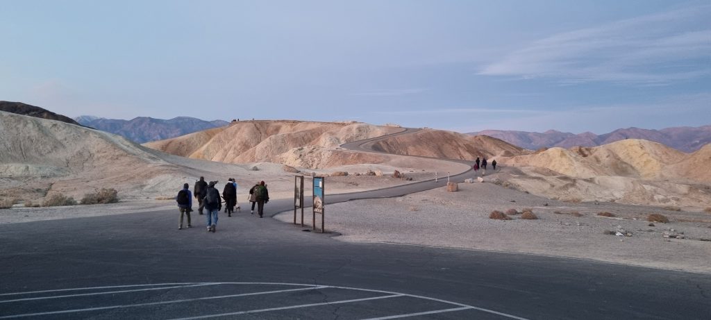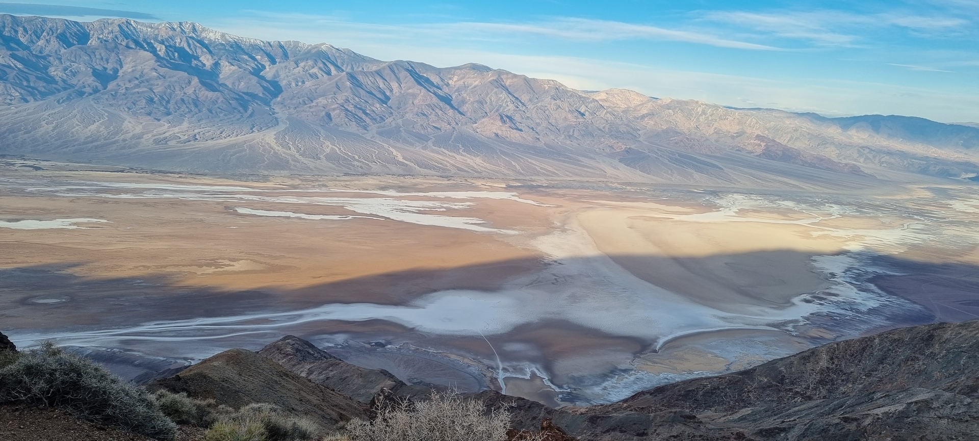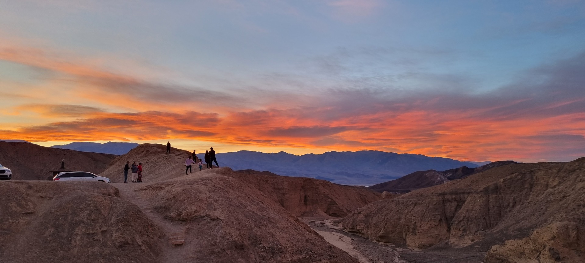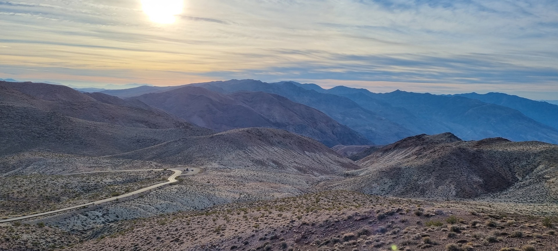 Naslednje jutro sva ujela sončni vzhod na razgledni Zabriskiejevi točki (Zabriskie Point), od koder se z višine dobrih dvesto metrov razprostira pogled na kotlino Badwater in gorovje Panamint. Pot sva nadaljevala do naslednje razgledne točke Dantejevega razgleda (Dante’s View), ki se nahaja na nadmorski višini okoli 1660 metrov in tako ponuja še mogočnejši razgled na solne ravnine in vrh Telescope Peak, ki je, kot že omenjeno, najvišja točka v parku.