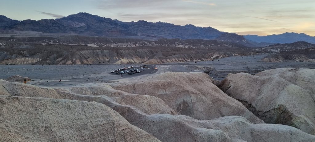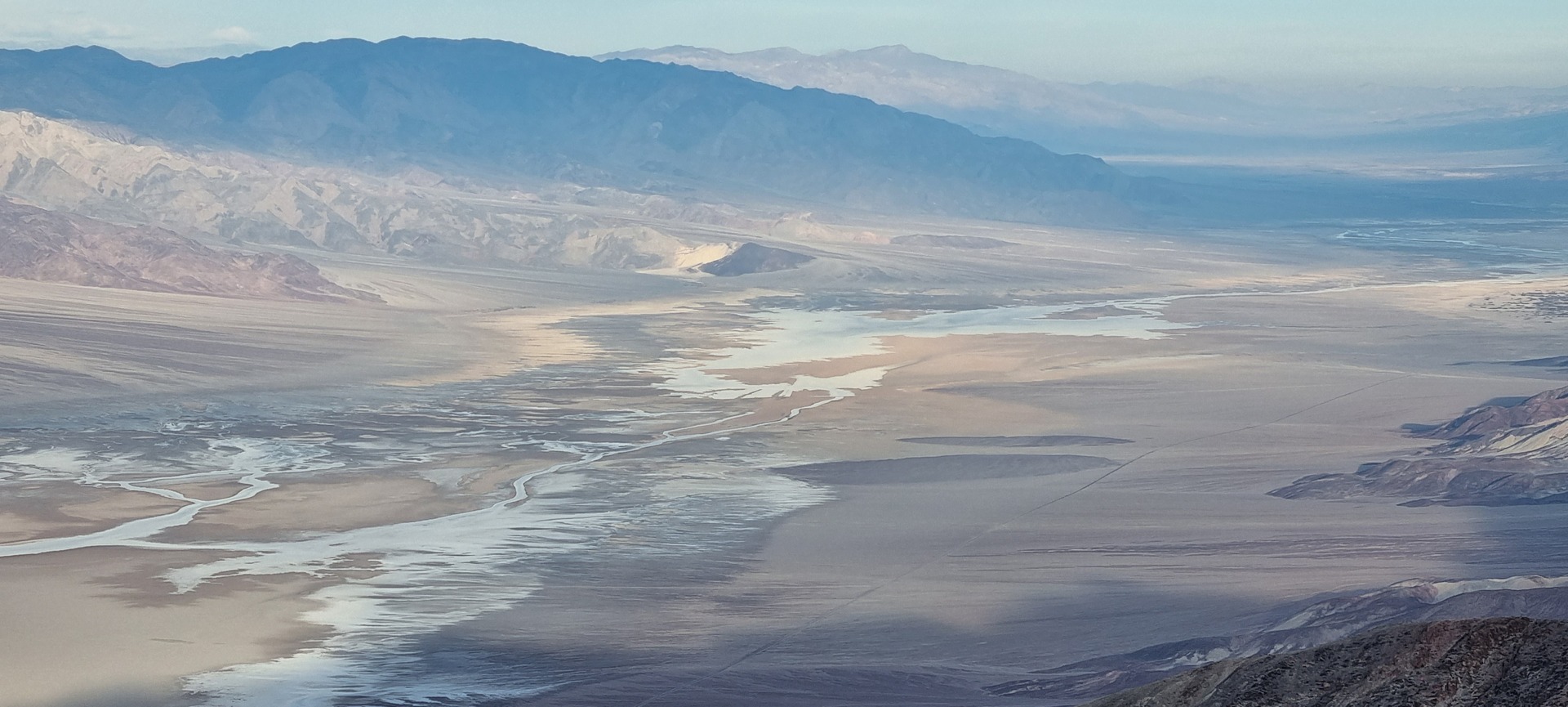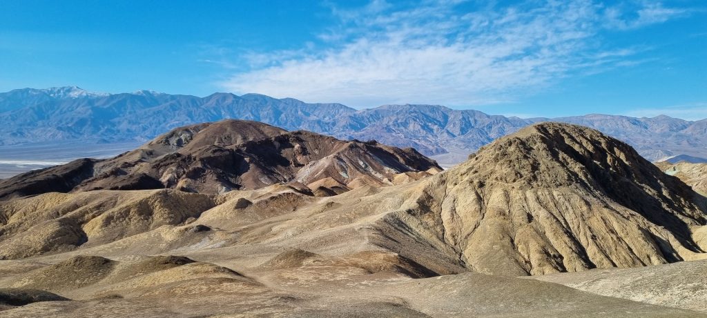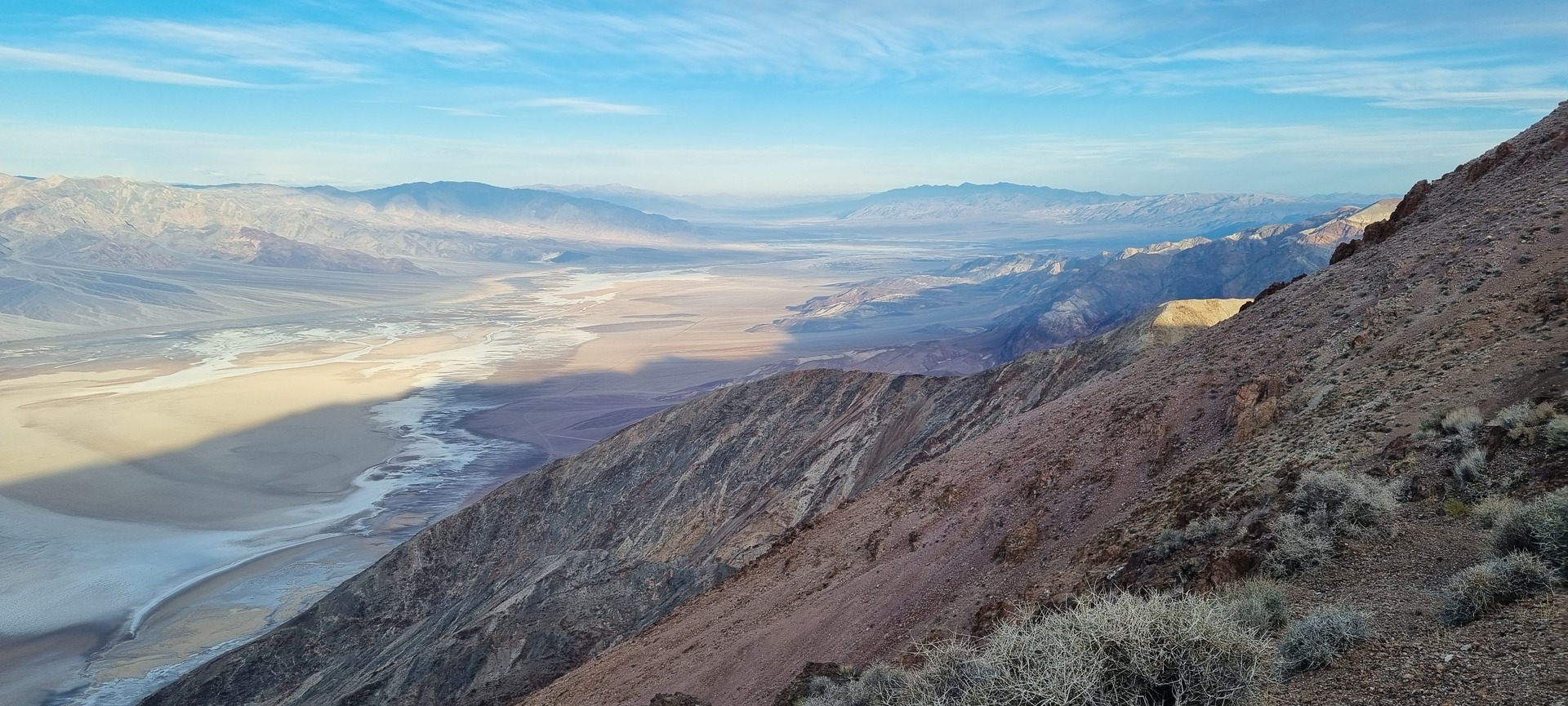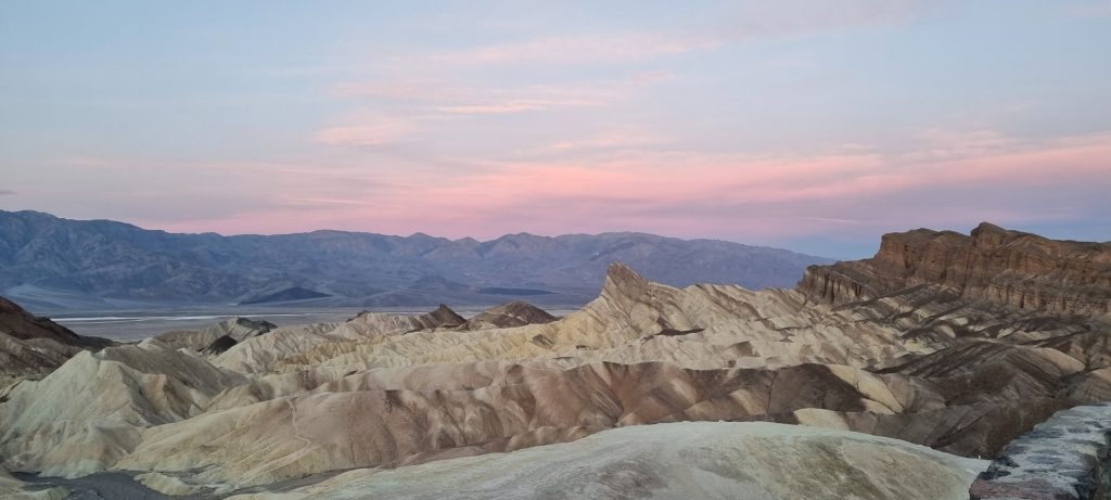 Naslednje jutro sva ujela sončni vzhod na razgledni Zabriskiejevi točki (Zabriskie Point), od koder se z višine dobrih dvesto metrov razprostira pogled na kotlino Badwater in gorovje Panamint. Pot sva nadaljevala do naslednje razgledne točke Dantejevega razgleda (Dante’s View), ki se nahaja na nadmorski višini okoli 1660 metrov in tako ponuja še mogočnejši razgled na solne ravnine in vrh Telescope Peak, ki je, kot že omenjeno, najvišja točka v parku.
