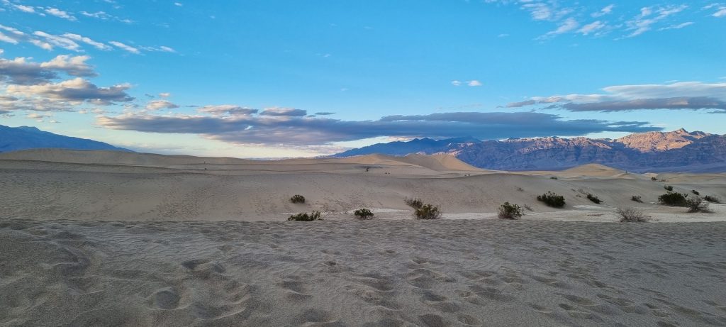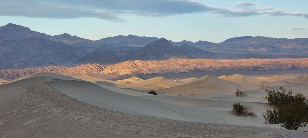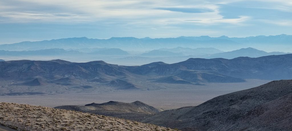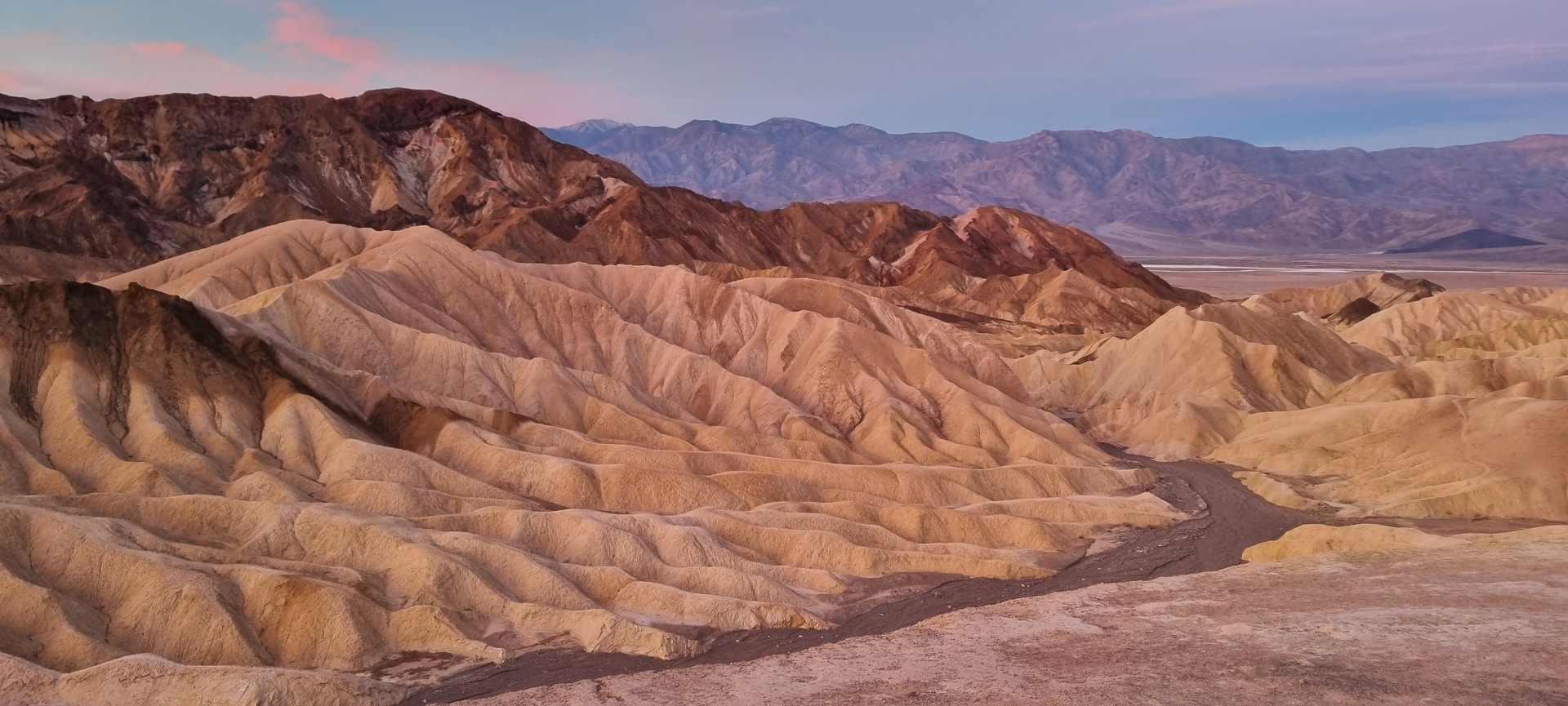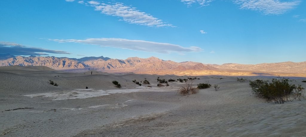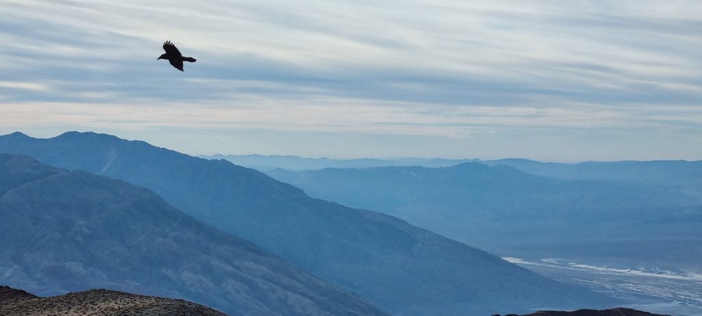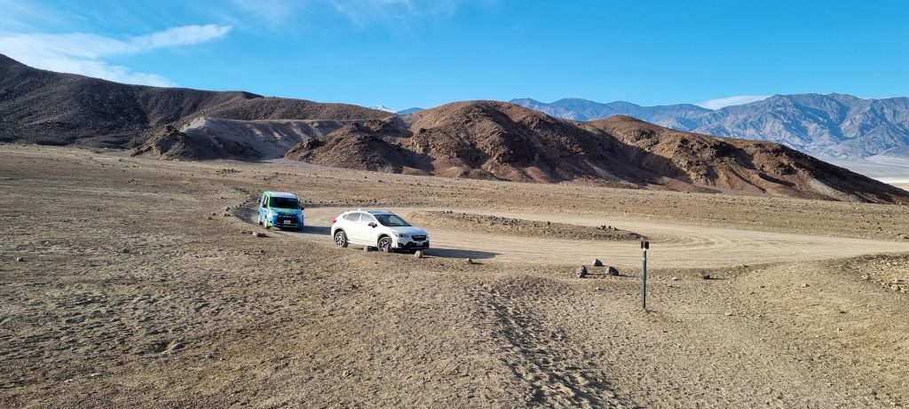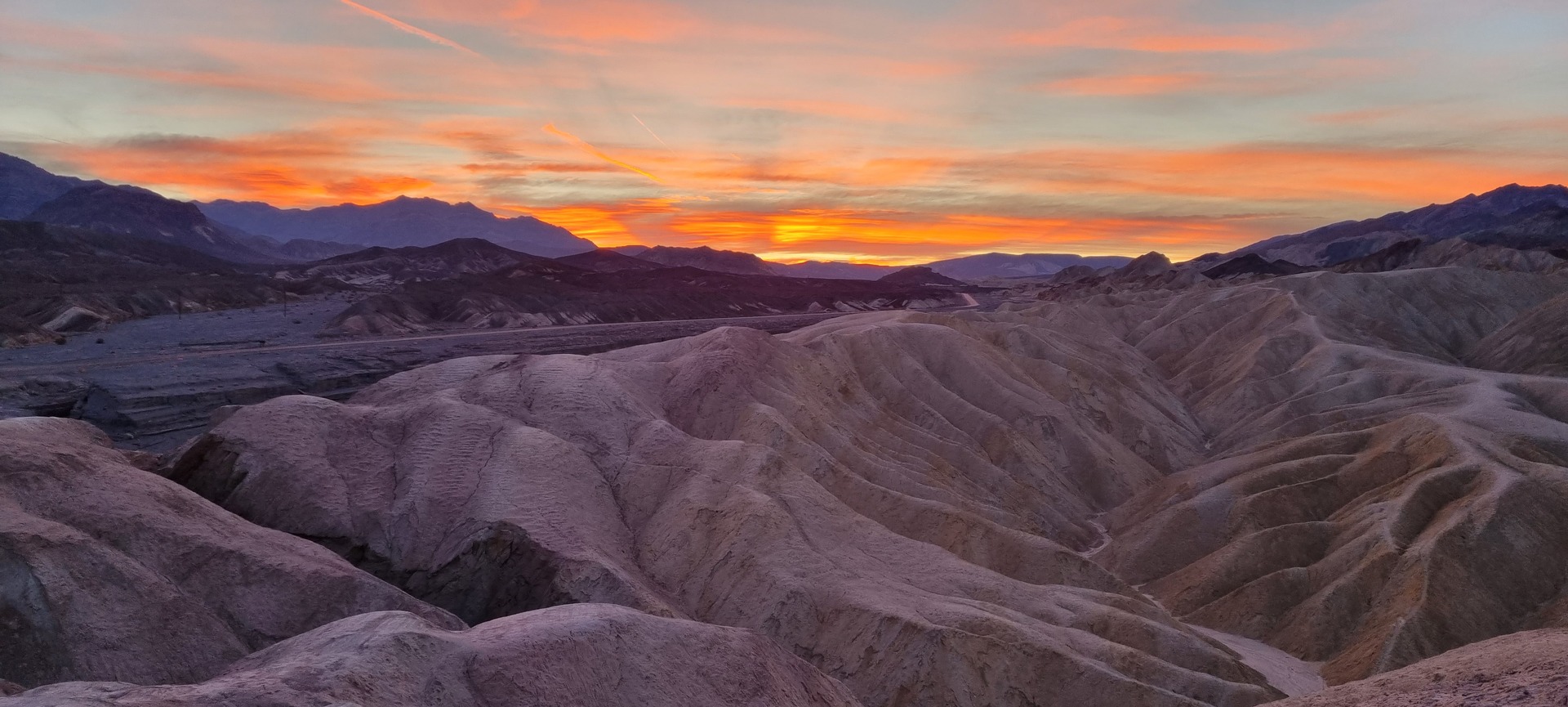 Naslednje jutro sva ujela sončni vzhod na razgledni Zabriskiejevi točki (Zabriskie Point), od koder se z višine dobrih dvesto metrov razprostira pogled na kotlino Badwater in gorovje Panamint. Pot sva nadaljevala do naslednje razgledne točke Dantejevega razgleda (Dante’s View), ki se nahaja na nadmorski višini okoli 1660 metrov in tako ponuja še mogočnejši razgled na solne ravnine in vrh Telescope Peak, ki je, kot že omenjeno, najvišja točka v parku.