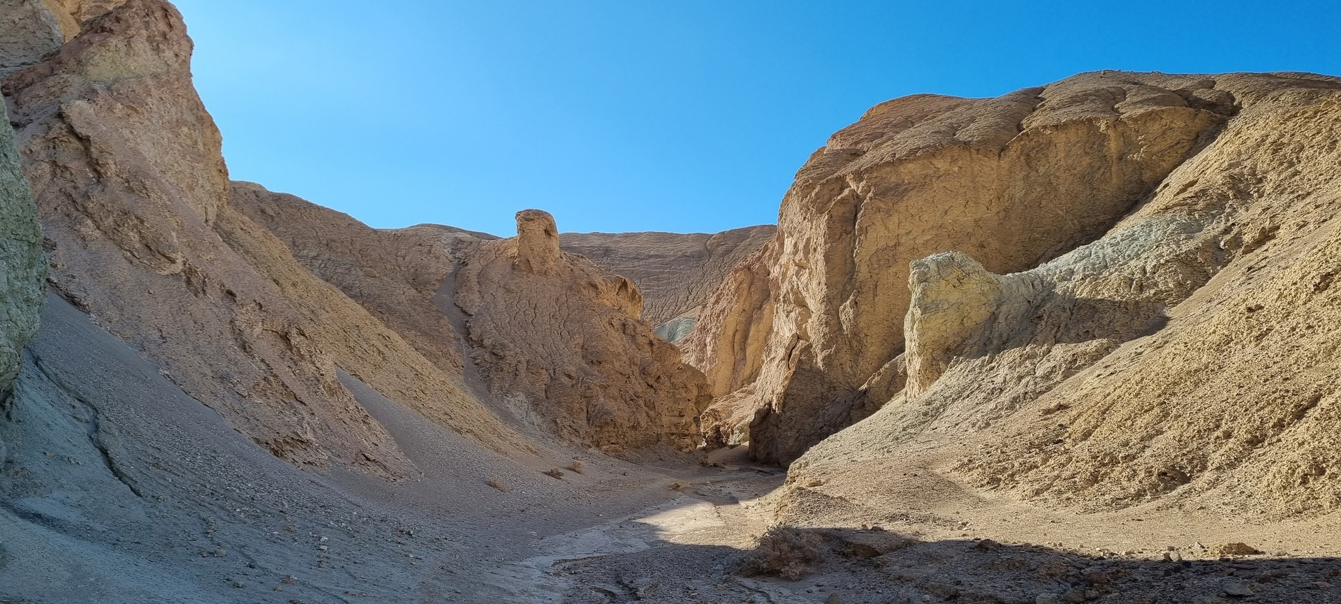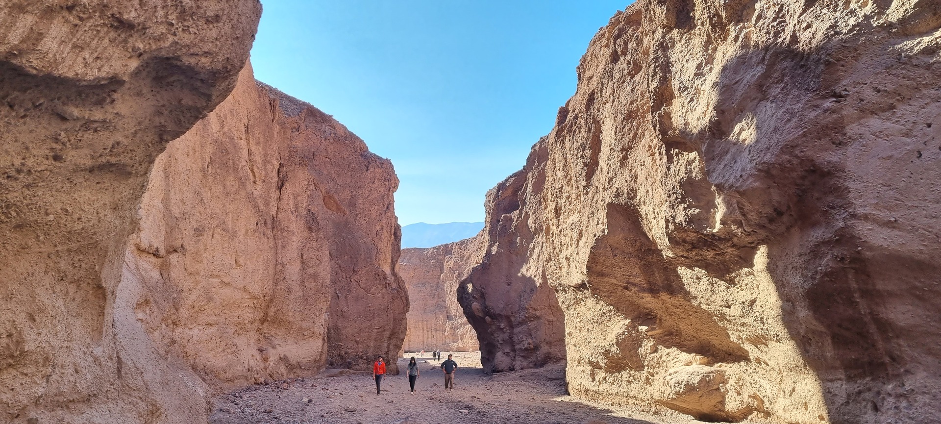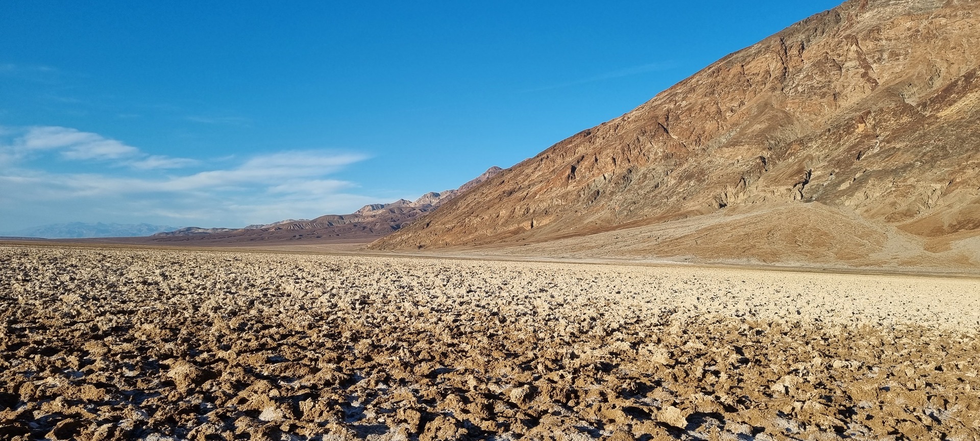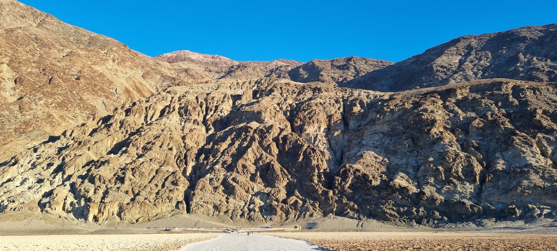 Kot že omenjeno je narodni park res ogromen: po vstopu v park je najprej sledila dvajsetminutna vožnja do centra za obiskovalce in kampa, kjer sva kasneje prenočila, potem pa še pol ure do prve zanimivosti, in sicer kotline Badwater, kjer se je v davnih časih nahajalo jezero Manly. Ko je jezero pred več deset tisoč leti izhlapelo, je za seboj pustilo veliko količino soli (natrijevega klorida) in nekaj kalcita, sadre in boraksa. Tla so še danes prekrita z debelo plastjo teh mineralov, po katerih se lahko obiskovalci sprehajamo in ki obsegajo več kot 500 km2. Večina soli se nahaja v t. i. solnih ravninah, v bližini pa najdemo tudi Hudičevo golf igrišče (Devil’s Golf Course), kjer so izredno ostre skale prekrite s plastjo soli. V kotlini se nahaja tudi najnižja točka ne samo v Dolini smrti ampak v celi Severni Ameriki, saj se Badwater nahaja na 86 metrih pod gladino morja. Legenda pravi, da so prvi raziskovalci kotlino poimenovali Badwater (slaba voda), ker so tu našli nekaj malo vode, ki pa naj bi bila tako slana, da je niti mule in osli niso hoteli piti. Od roba kotline pa je le dobrih dvajset kilometrov zračne razdalje oddaljen vrh Telescope Peak v gorovju Panamint z nadmorsko višini 3 368 metrov.