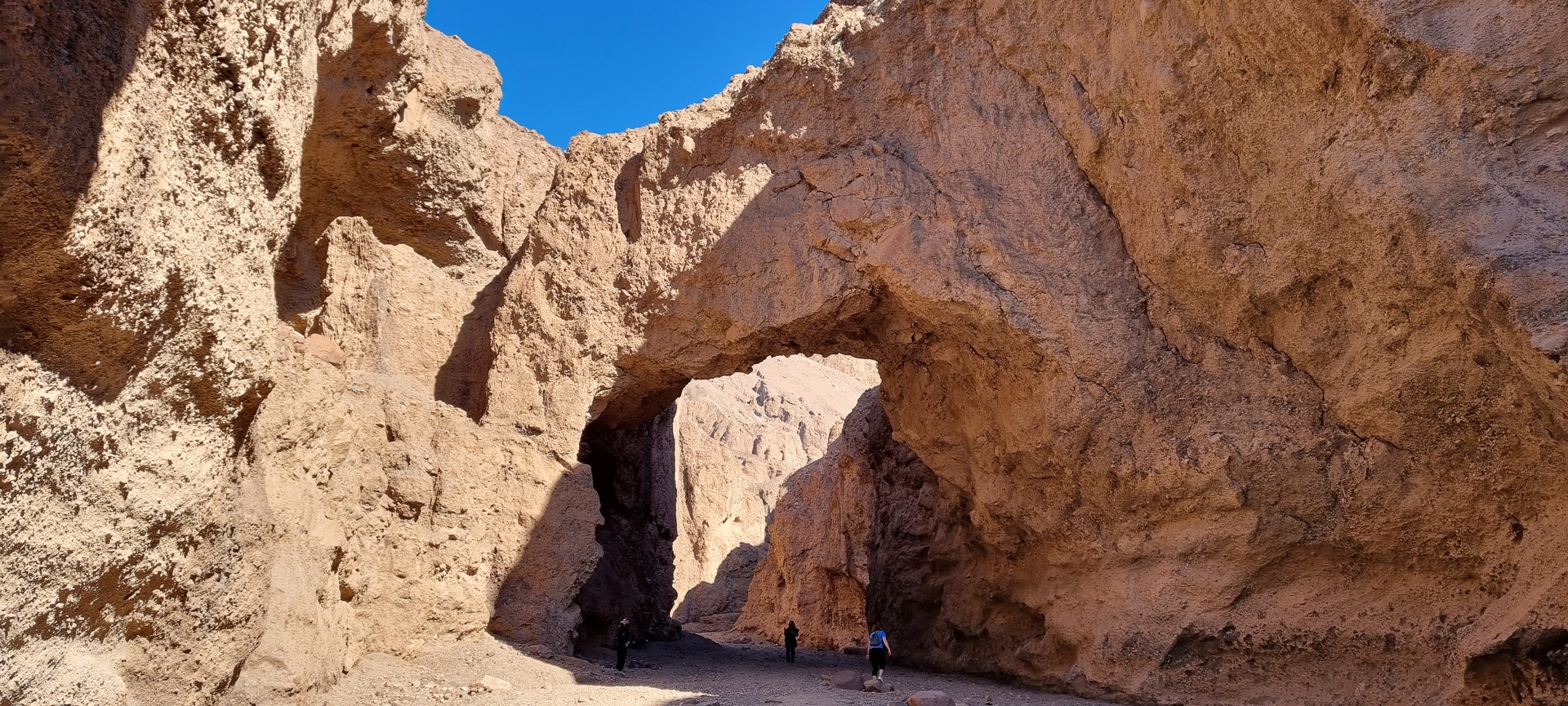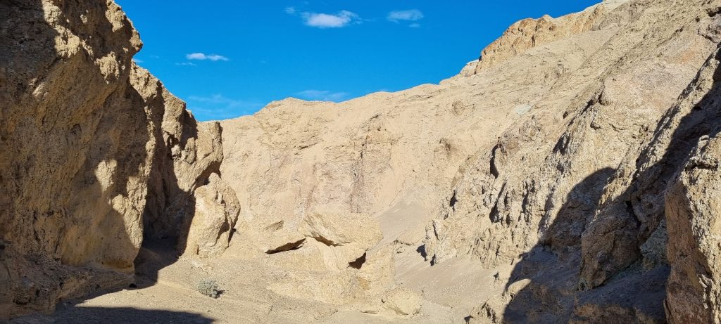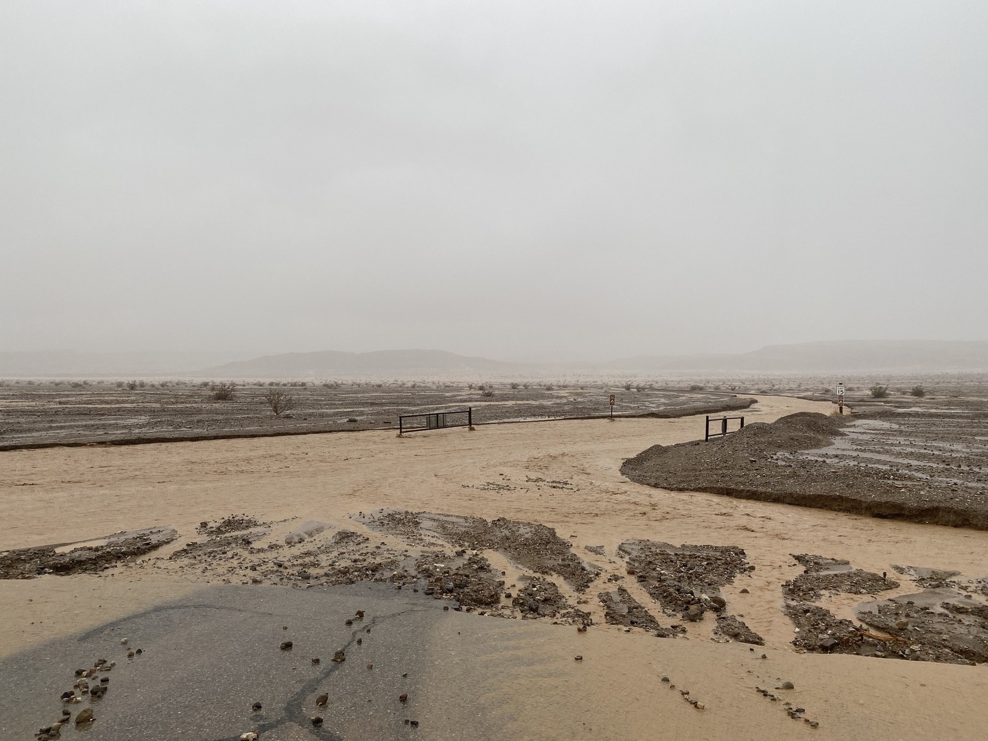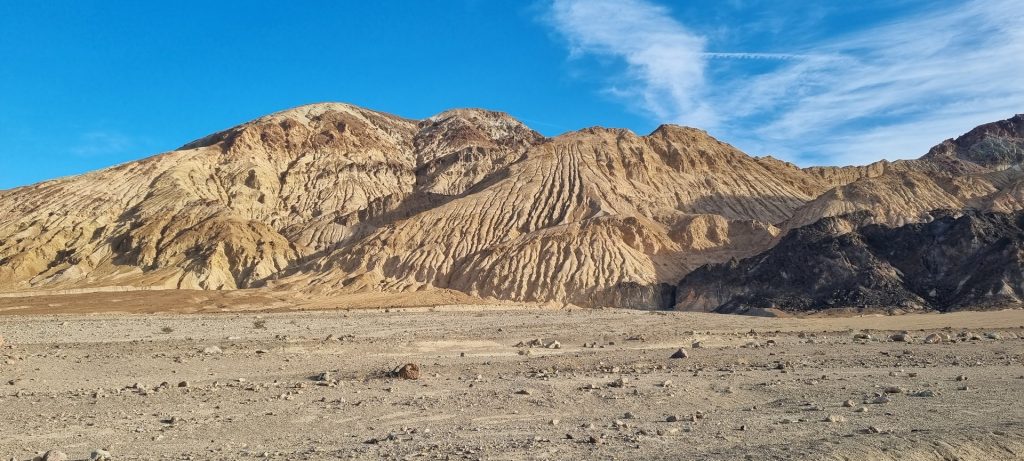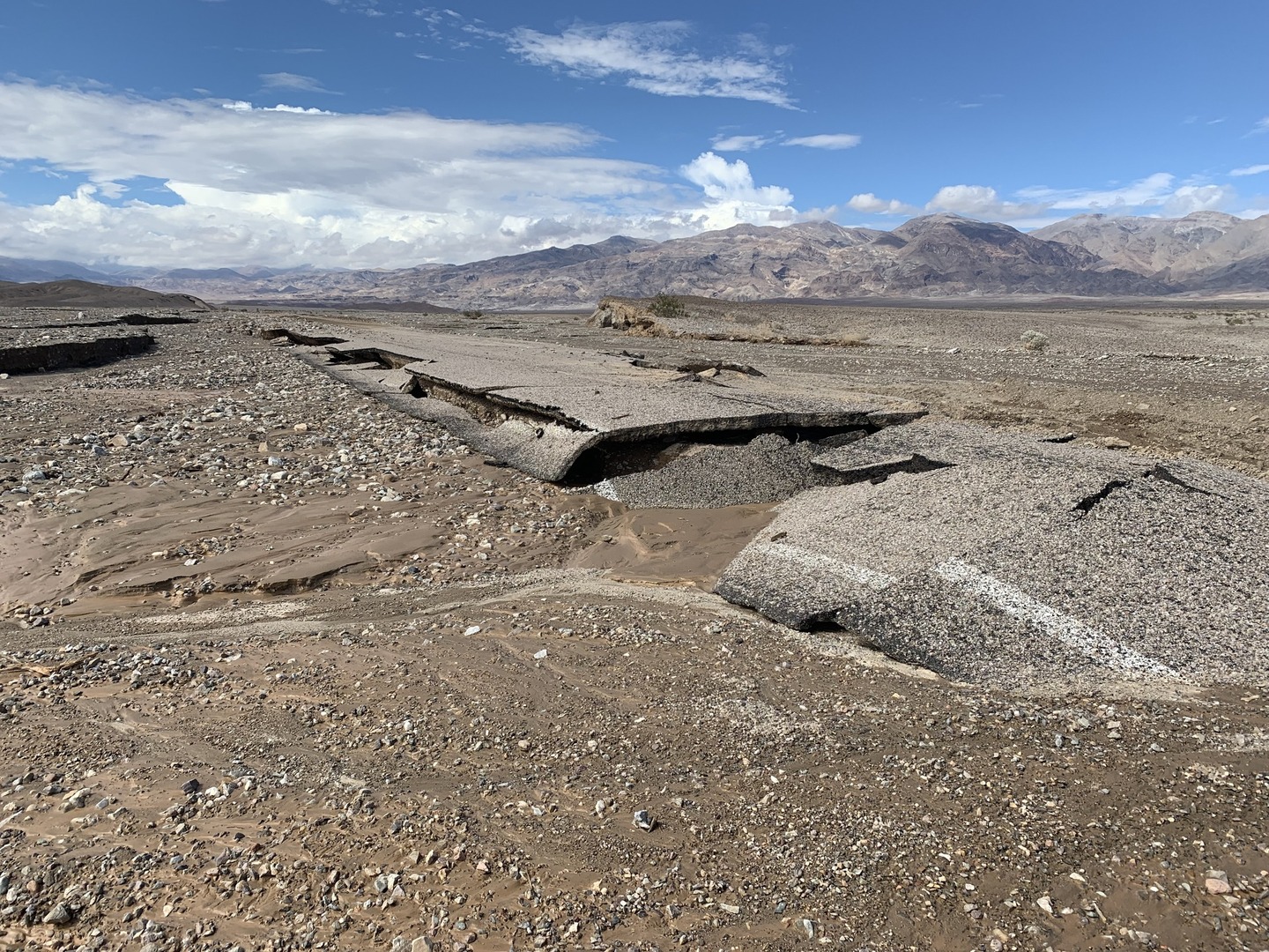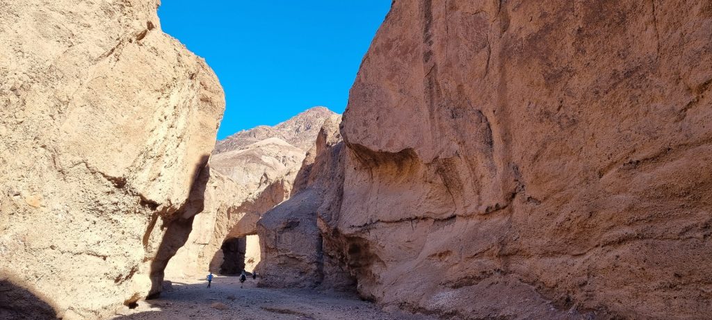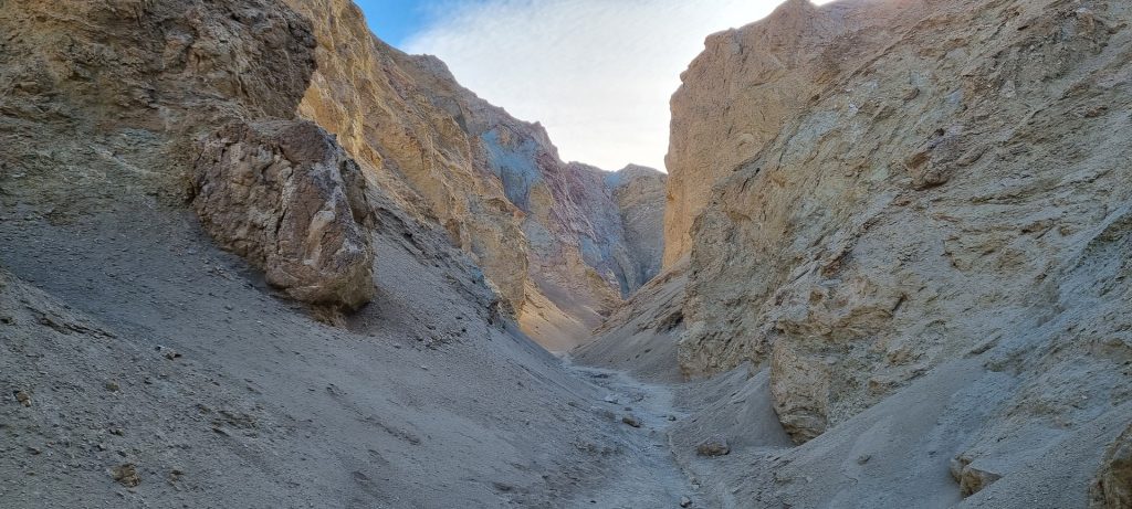 Čeprav se Dolina smrti nahaja v puščavi, ne izgleda tako, kot bi mogoče pričakovali. Vsaj moja prva asociacija ob besedi “puščava” so ogromne peščene sipine, ki se raztezajo v neskončnost. Nekaj sipin sicer najdemo, drugače pa so tla v bolj položnih delih parka prekrita s kamni, hribe pa sestavljajo večinoma gole skale. Skozi te skale tečejo tudi kanjoni, ki so jih v davnih časih izdolble reke. Ker tla slabo požirajo vodo, lahko tudi manjše količine padavin povzročijo katastrofalne poplave – avgusta letos je bil skoraj cel park zaprt nekaj tednov zaradi 43 milimetrov padavin. V enem dnevu so 5. 8. zapadle kar tri četrtine povprečne količine padavin v nekaj urah, zato je bil ta dan najbolj deževen dan v zgodovini narodnega parka. Zaradi padavin avgusta in septembra je bil decembra, ko sva obiskala Dolino smrti, del parka še vedno nedostopen. Več slik je na spletni strani nps.gov.
