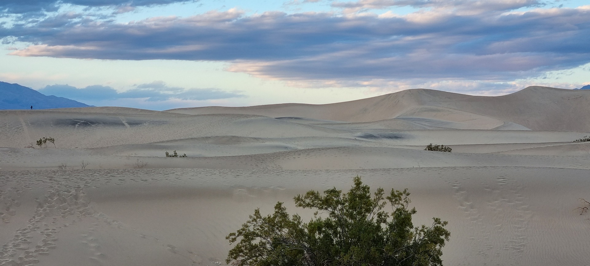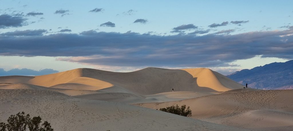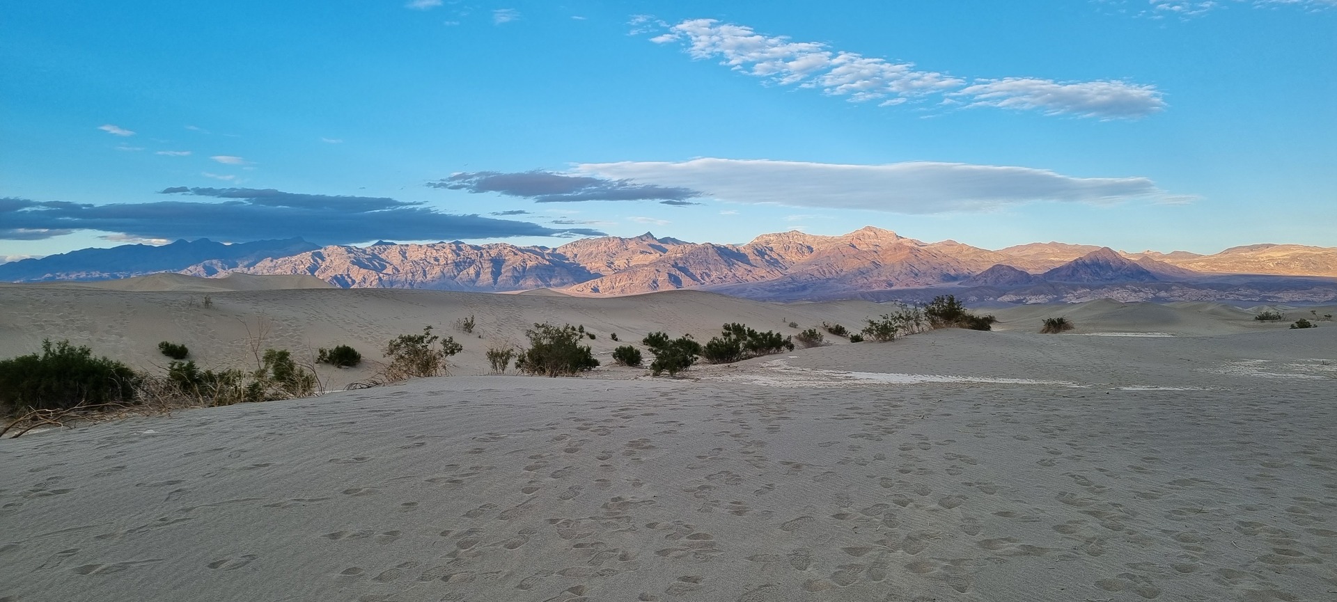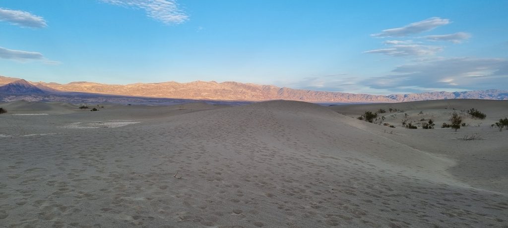 Dan sva zaključila še z ogledom peščenih sipin Mesquite Flat, ki se nahajajo v bližini Stovepipe Wellsa. V Dolini smrti ni veliko lokacij, kjer so se izoblikovale peščine, ker morajo za to biti izpolnjeni določeni pogoji: potreben je vir peska, za kar tu poskrbi erozija gorovja severno od sipin; potreben je veter, ki razpiha pesek; za konec pa je potrebna še nekakšna ovira, zaradi katere veter peska ne more odnesti dalje, tu je to gorovje na južni strani. Na dnu sipin se je ponekod pesek sprijel v trde ploščice, verjetno zaradi padavin.