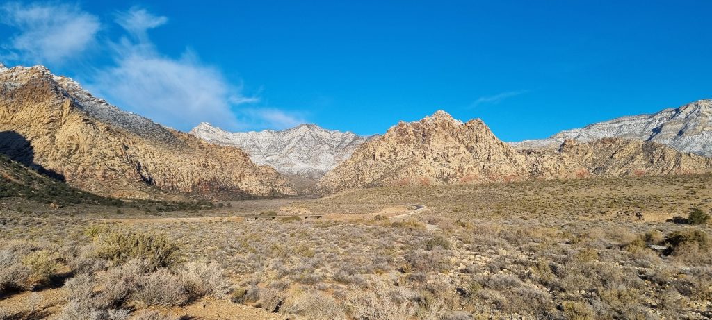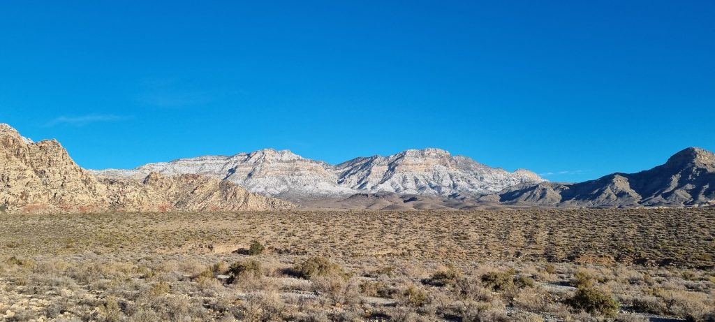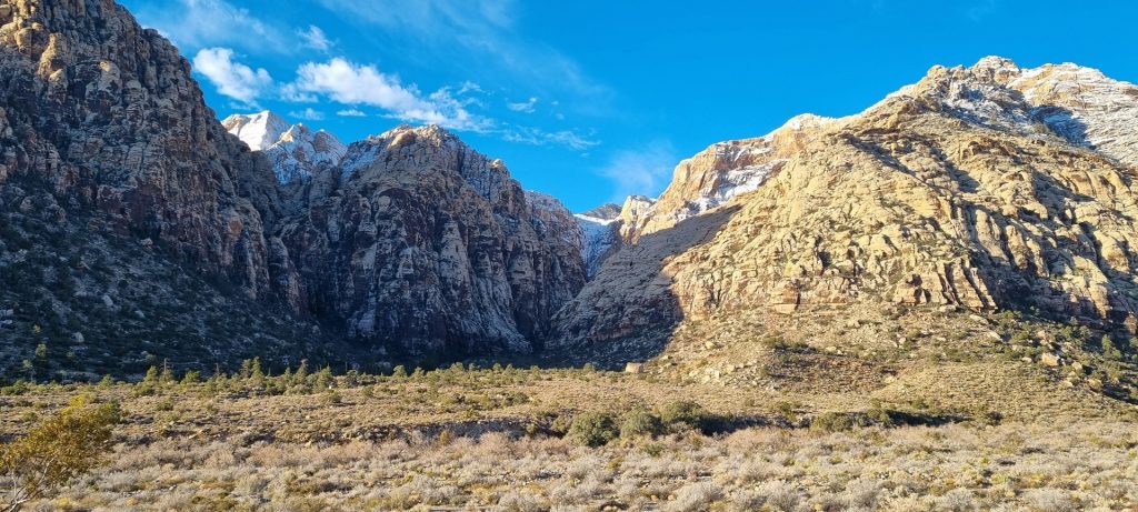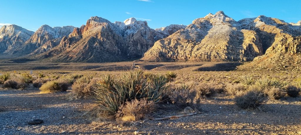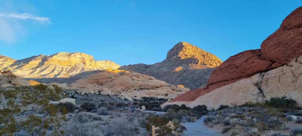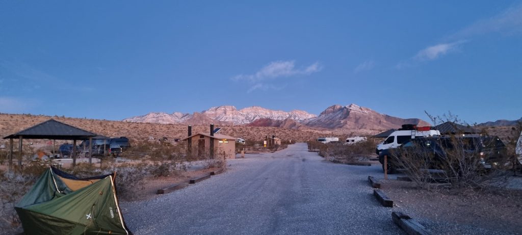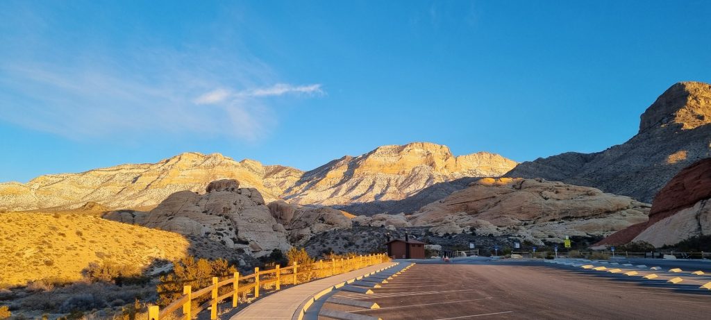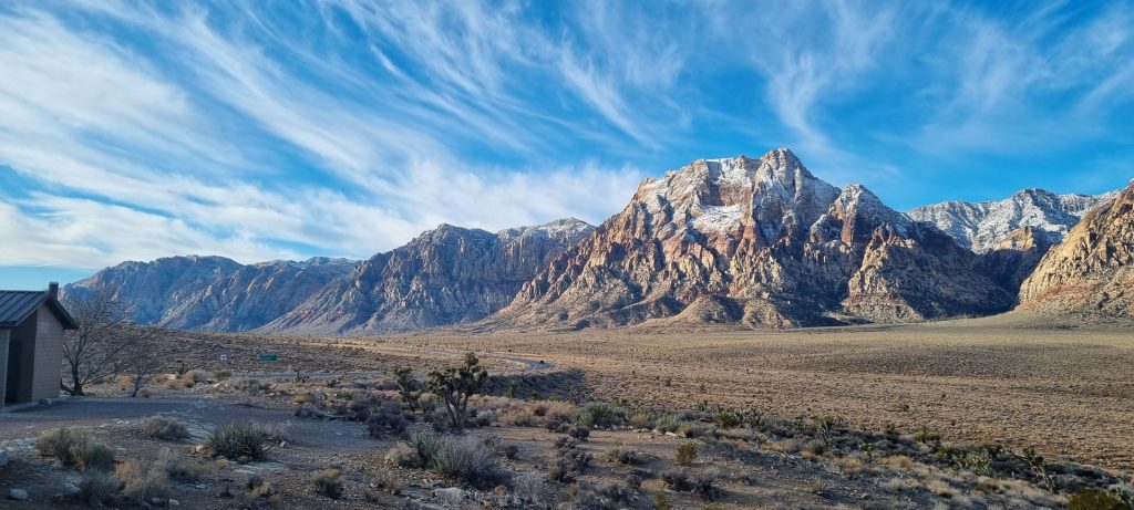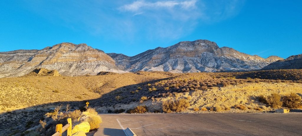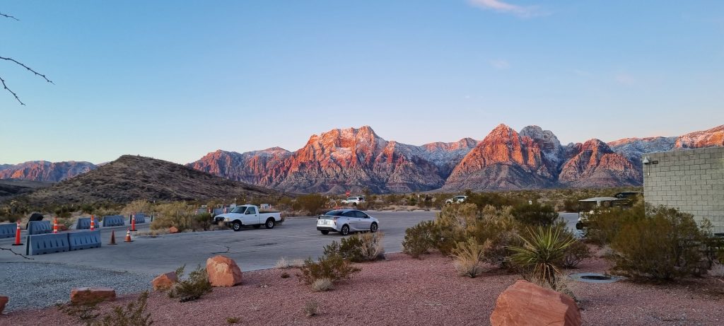 V noči, preden sva obiskala Red Rock Canyon, je Las Vegas z okolico dočakal nekaj dežja, temperature pa so se spustile blizu ničle. V hribih, od katerih se jih nekaj dviga na več kot 2000 metrov nadmorske višine, so se temperature spustile pod ledišče, vrhovi pa so bili zjutraj prekriti z nadpovprečno količino snega. Red Rock Canyon sva obiskala zgodaj zjutraj – za obiskovalce naj bi bil odprt od šestih zjutraj, midva pa sva prišla do vhoda okoli pol sedmih. Zaradi padavin in nizkih temperatur pa še ni bil odprt, ker so pregledovali cesto, da ne bi bilo slučajno preveč poledice, da bi lahko obiskovalcem omogočili varen vstop. Zapornico so dvignili okoli 6:45 in tako sva bila prva, ki sva ta dan z avtom vstopila v Red Rock Canyon.