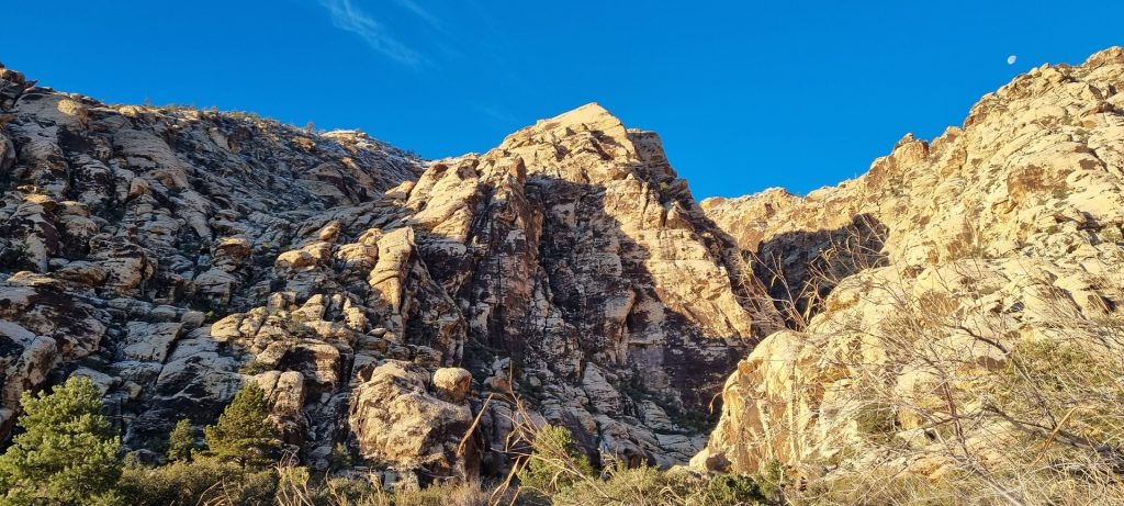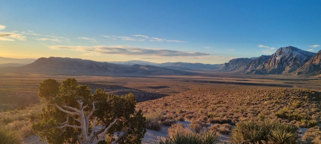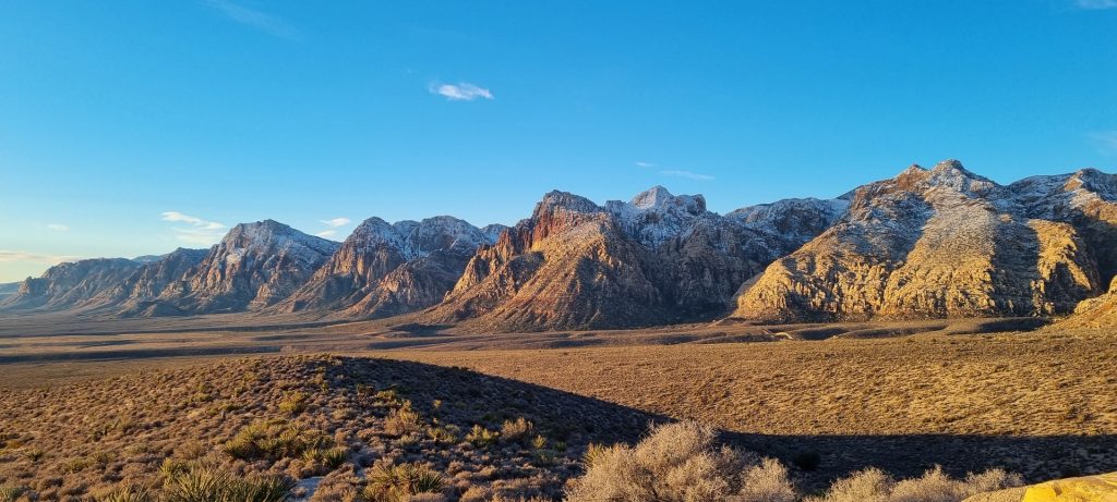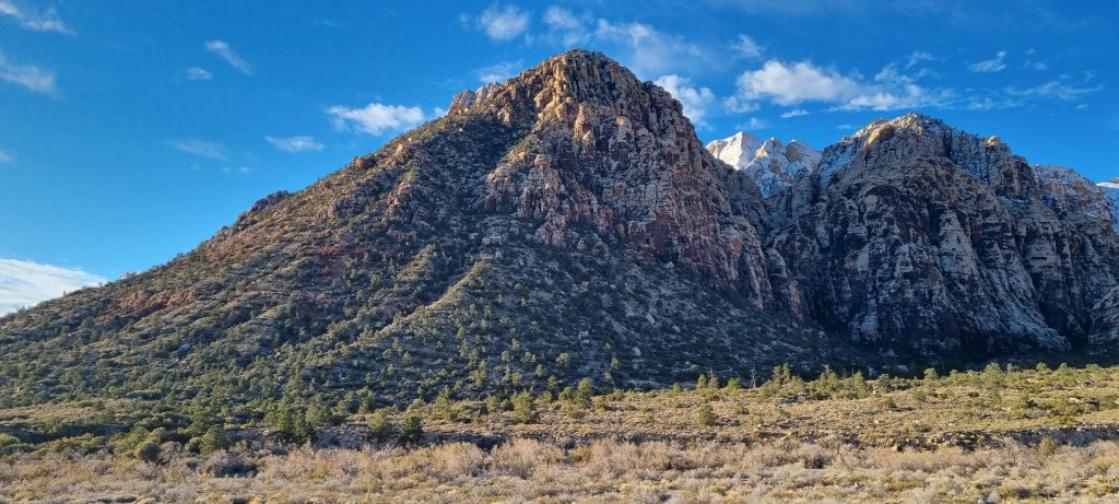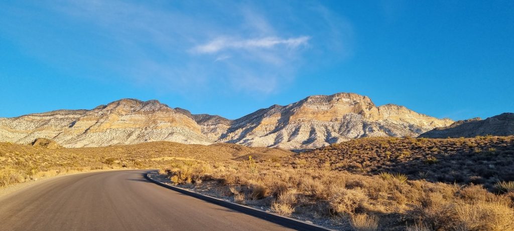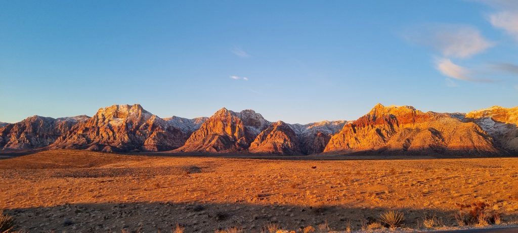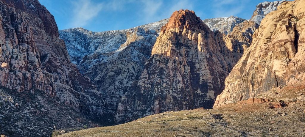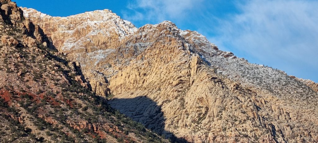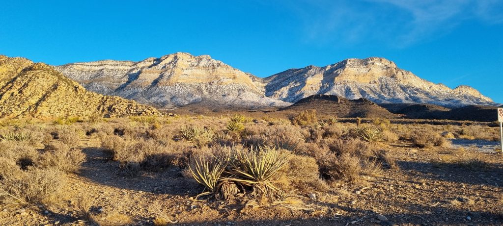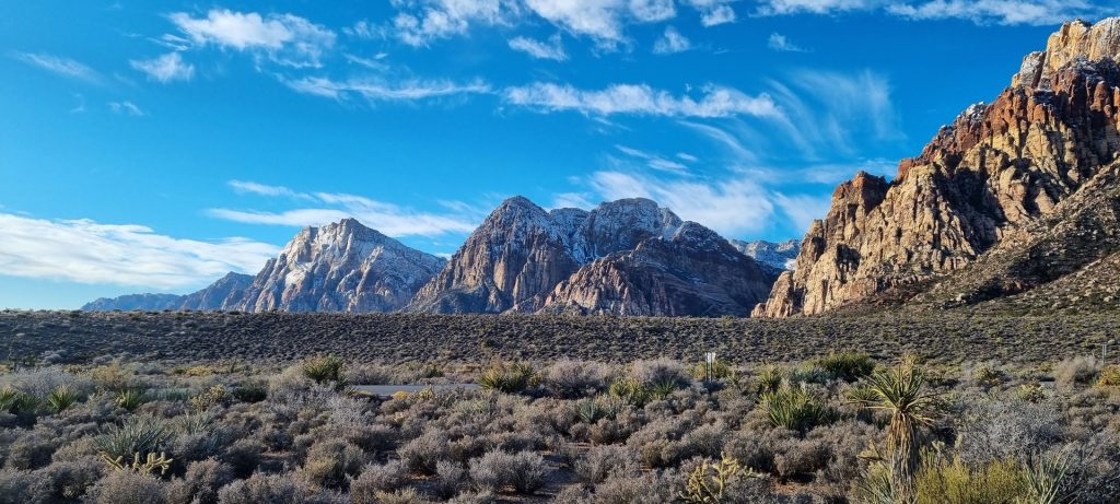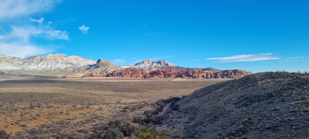 V noči, preden sva obiskala Red Rock Canyon, je Las Vegas z okolico dočakal nekaj dežja, temperature pa so se spustile blizu ničle. V hribih, od katerih se jih nekaj dviga na več kot 2000 metrov nadmorske višine, so se temperature spustile pod ledišče, vrhovi pa so bili zjutraj prekriti z nadpovprečno količino snega. Red Rock Canyon sva obiskala zgodaj zjutraj – za obiskovalce naj bi bil odprt od šestih zjutraj, midva pa sva prišla do vhoda okoli pol sedmih. Zaradi padavin in nizkih temperatur pa še ni bil odprt, ker so pregledovali cesto, da ne bi bilo slučajno preveč poledice, da bi lahko obiskovalcem omogočili varen vstop. Zapornico so dvignili okoli 6:45 in tako sva bila prva, ki sva ta dan z avtom vstopila v Red Rock Canyon.