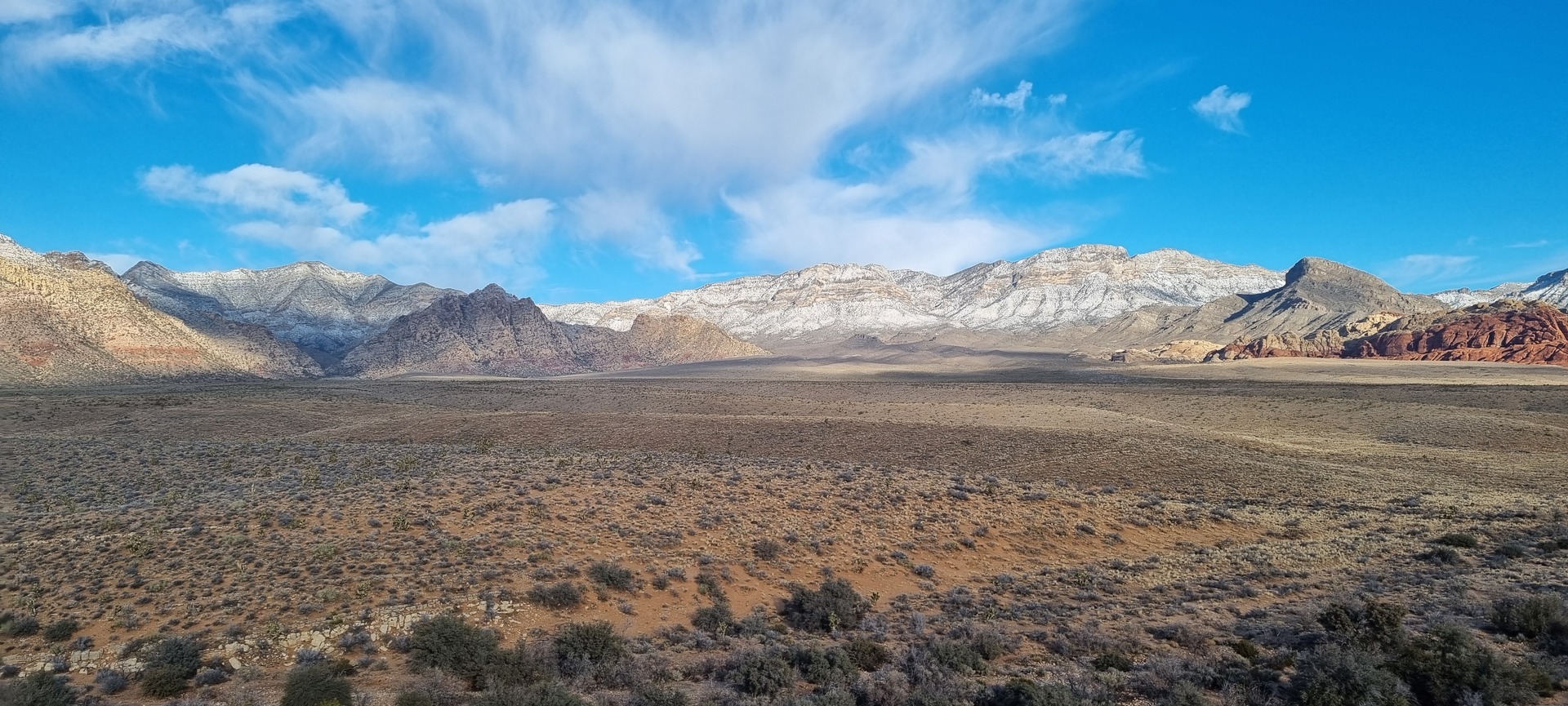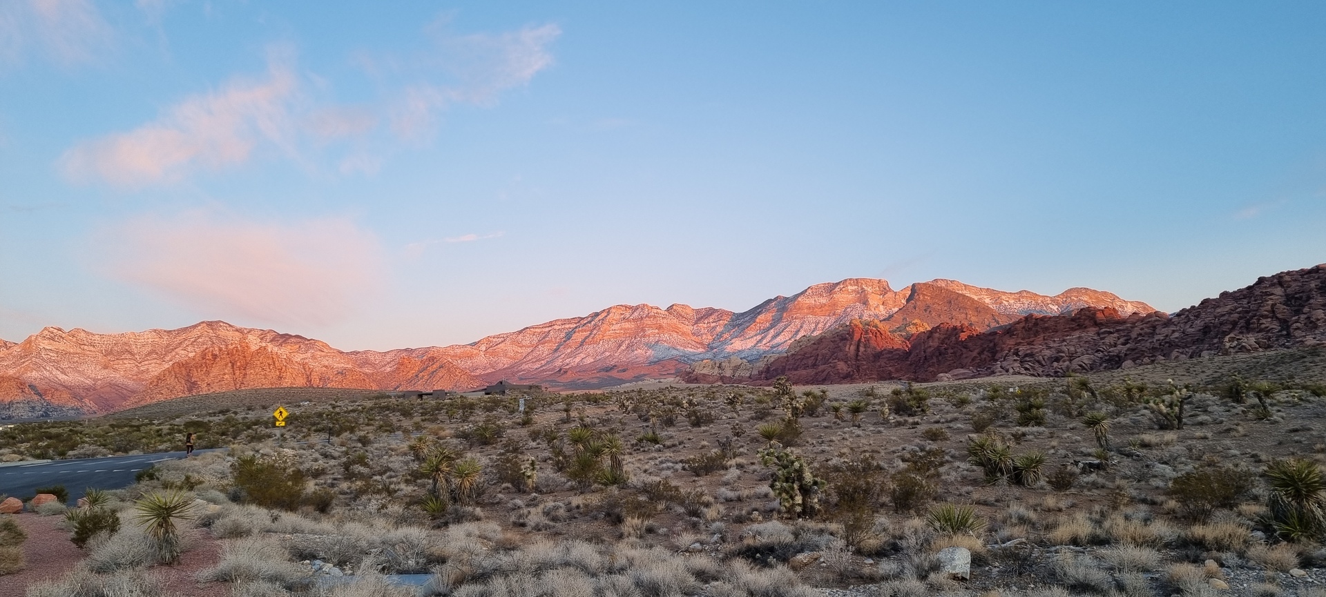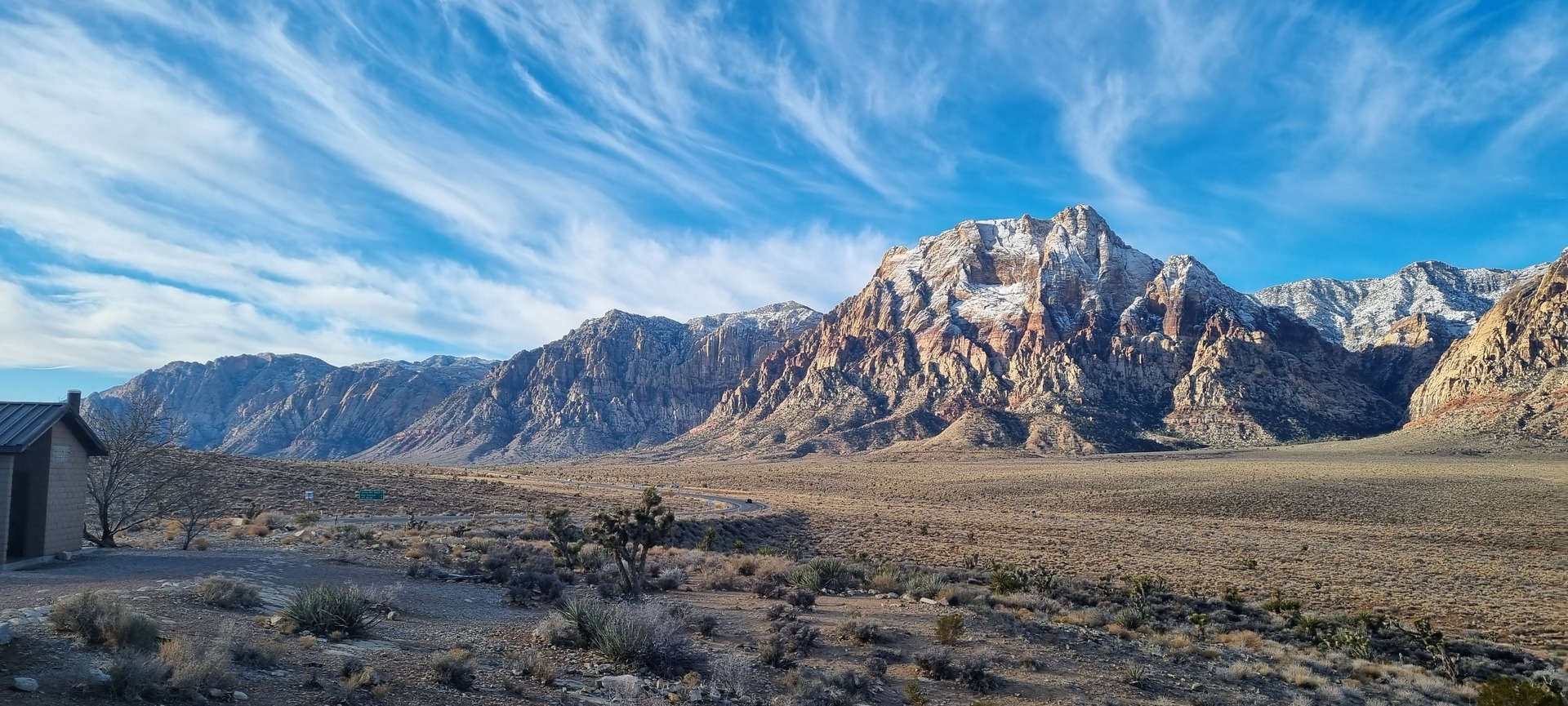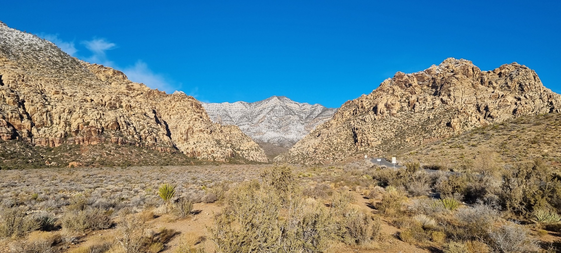 V noči, preden sva obiskala Red Rock Canyon, je Las Vegas z okolico dočakal nekaj dežja, temperature pa so se spustile blizu ničle. V hribih, od katerih se jih nekaj dviga na več kot 2000 metrov nadmorske višine, so se temperature spustile pod ledišče, vrhovi pa so bili zjutraj prekriti z nadpovprečno količino snega. Red Rock Canyon sva obiskala zgodaj zjutraj – za obiskovalce naj bi bil odprt od šestih zjutraj, midva pa sva prišla do vhoda okoli pol sedmih. Zaradi padavin in nizkih temperatur pa še ni bil odprt, ker so pregledovali cesto, da ne bi bilo slučajno preveč poledice, da bi lahko obiskovalcem omogočili varen vstop. Zapornico so dvignili okoli 6:45 in tako sva bila prva, ki sva ta dan z avtom vstopila v Red Rock Canyon.