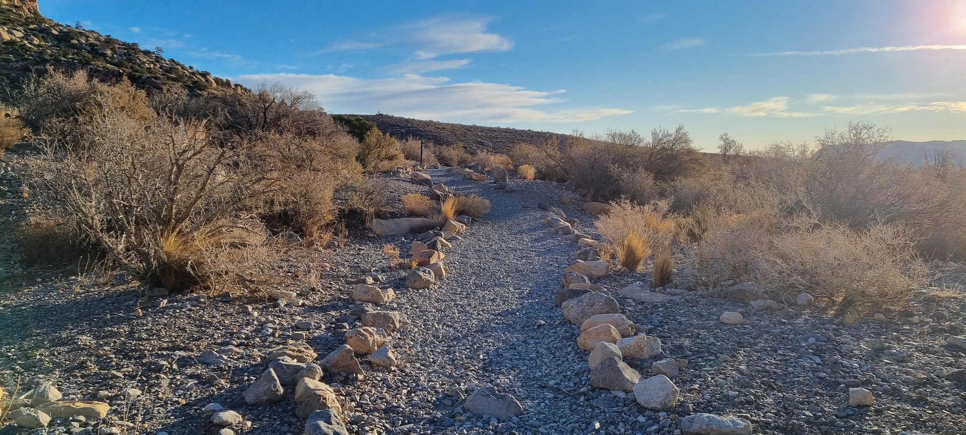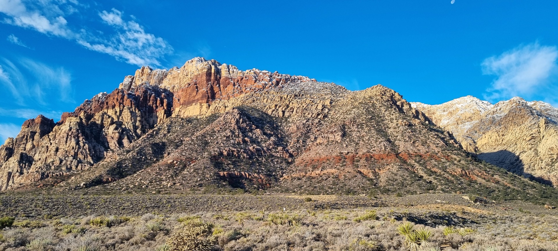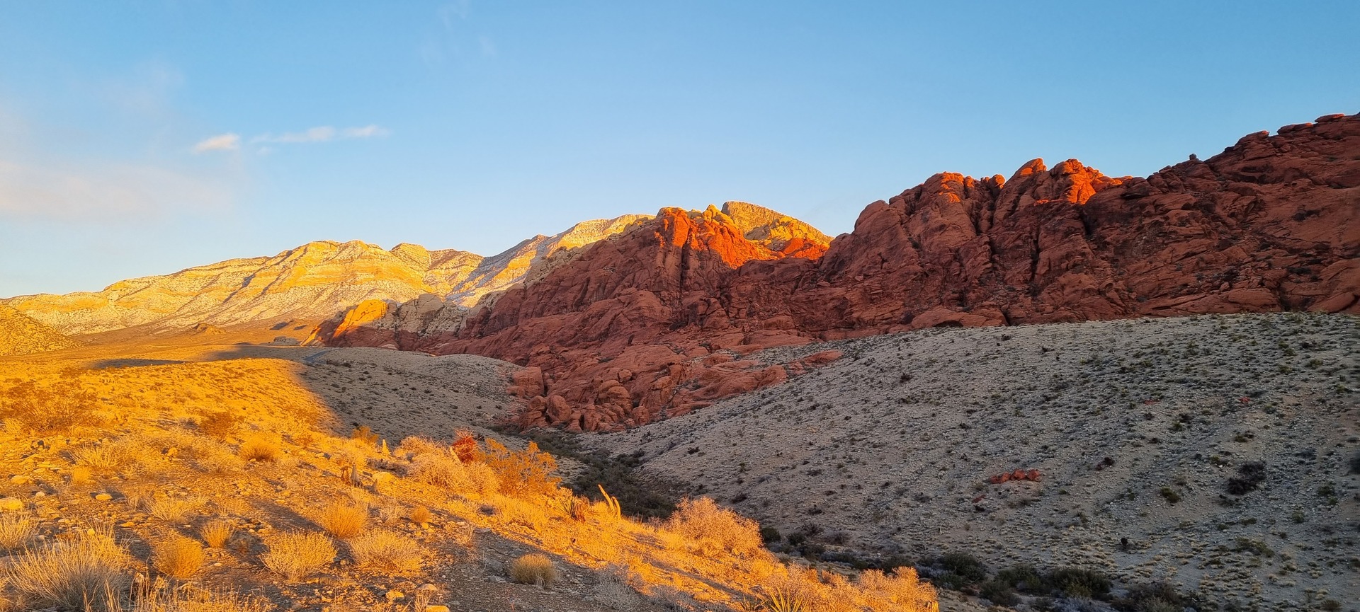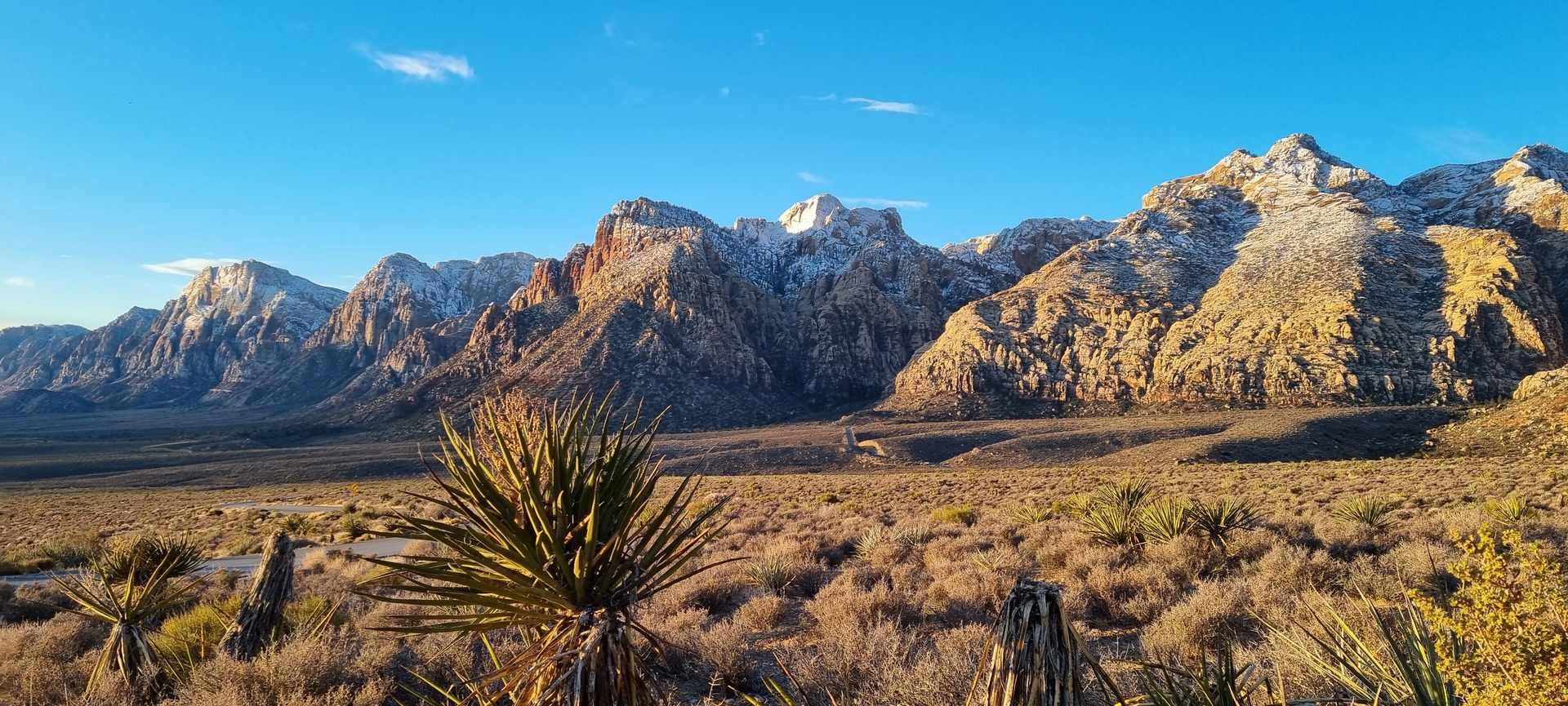 V noči, preden sva obiskala Red Rock Canyon, je Las Vegas z okolico dočakal nekaj dežja, temperature pa so se spustile blizu ničle. V hribih, od katerih se jih nekaj dviga na več kot 2000 metrov nadmorske višine, so se temperature spustile pod ledišče, vrhovi pa so bili zjutraj prekriti z nadpovprečno količino snega. Red Rock Canyon sva obiskala zgodaj zjutraj – za obiskovalce naj bi bil odprt od šestih zjutraj, midva pa sva prišla do vhoda okoli pol sedmih. Zaradi padavin in nizkih temperatur pa še ni bil odprt, ker so pregledovali cesto, da ne bi bilo slučajno preveč poledice, da bi lahko obiskovalcem omogočili varen vstop. Zapornico so dvignili okoli 6:45 in tako sva bila prva, ki sva ta dan z avtom vstopila v Red Rock Canyon.